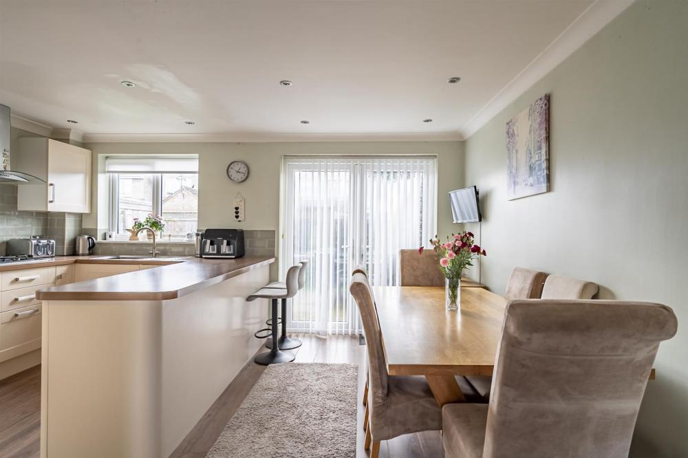 A composite entrance door opens to a hallway, with stairs leading to the first floor and a door leading to a bay fronted living room, centring upon a feature fire place with electric fire. A spacious and modern open plan kitchen / diner has a breakfast bar, inset ceiling spot lights, a side door and French doors opening to the rear garden. The integrated appliances include, a gas hob with extractor hood over, electric oven, dishwasher and washing machine.