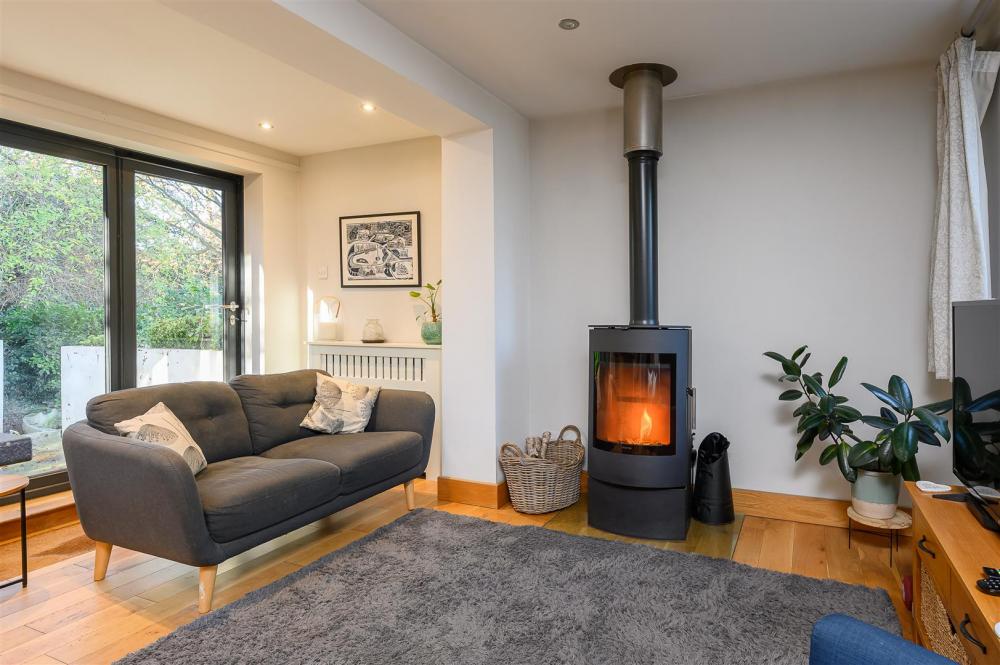 To the rear sits the impressive open-plan kitchen/diner, fitted with a range of wall and base units as well as integrated ovens and microwave. A large central island with induction hob forms the heart of the room, which also provides generous space for a dining table and relaxed seating area. This space is enhanced by a log-burning stove and bi-fold doors that open directly onto the rear garden. A utility room and downstairs cloakroom complete the ground floor.