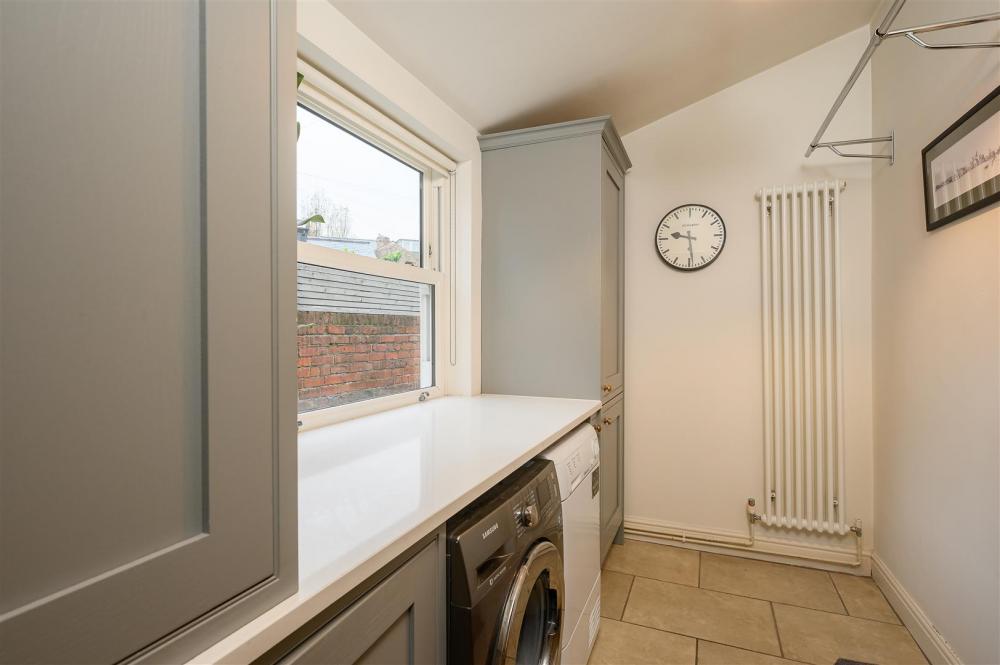Continuing to the rear of the property there is a stunning high specification kitchen with luxury features such as Belfast sink, brass furnishings and quartz worktops. Beyond, lies a separate utility room, with plenty of storage and space for a washer and dryer.