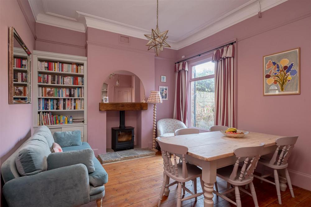 The grand entrance hall leads to the principal reception rooms. A well-appointed living room lies to the front, boasting high ceilings, original woodwork and a log burning stove. The separate dining room has ample space for dining and relaxation together with log burner and bespoke fitted storage.