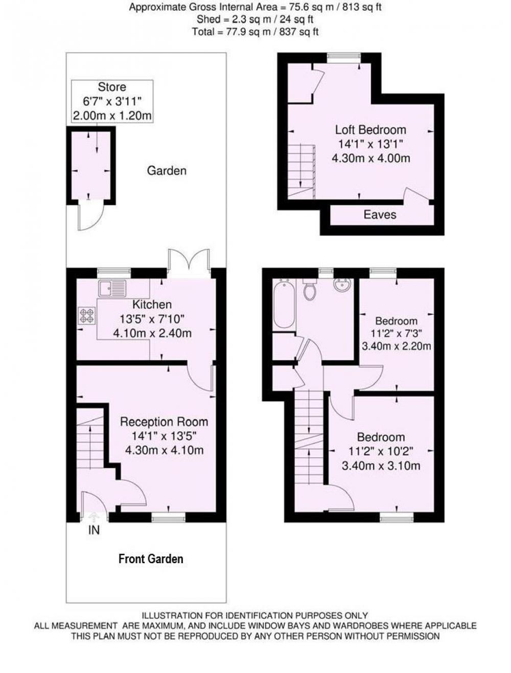 Upstairs are two bedrooms, a generous double with fitted cupboard and a smaller double, along with a modern bathroom with shower over bath. A further spacious loft room with dormer window and eaves storage occupies the top floor.