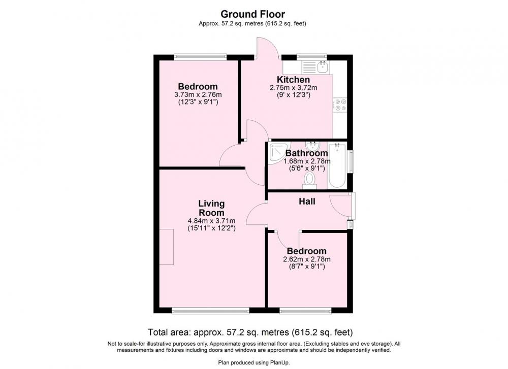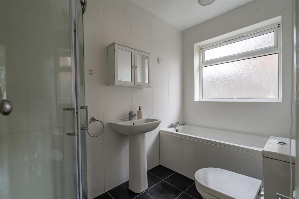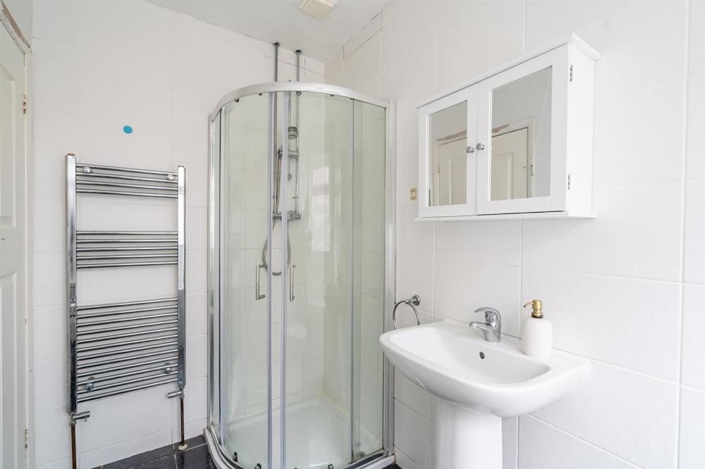 The accommodation includes a spacious living room overlooking the front garden, and a fitted kitchen to the rear with an integrated gas hob, oven, and washer dryer. There are two well-proportioned bedrooms, both served by a bathroom with bath and separate corner shower.