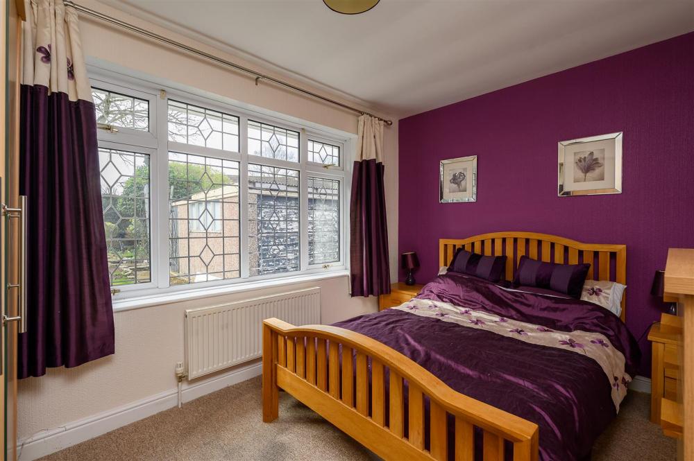 The property is approached via a driveway leading to the side entrance, which opens into a hallway. A spacious and light-filled living room enjoys pleasant views over the front garden. The modern fitted kitchen is well-equipped with an integrated hob, oven, and fridge freezer, along with space for a washer dryer.