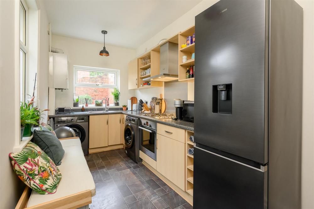 A small forecourt, which has been recently capped by a local stone mason with natural coping stones, brings you to the front door where you step into a hallway giving access firstly to the living room that features stripped and stained floorboards, a large bay window, an arched Victorian style feature fireplace with shelving and cupboards to one alcove. Next is the dining room, with engineered oak flooring, a similar fireplace, window into the sun room and a door that takes you through to the kitchen that provides an integral cooker, gas hob and extractor hood, together with space for a tall fridge/freezer and under counter plumbing for additional appliances. The sun room is a lovely room and has been decorated really tastefully. It is a great place to relax on a sunny day and looks out over the courtyard.