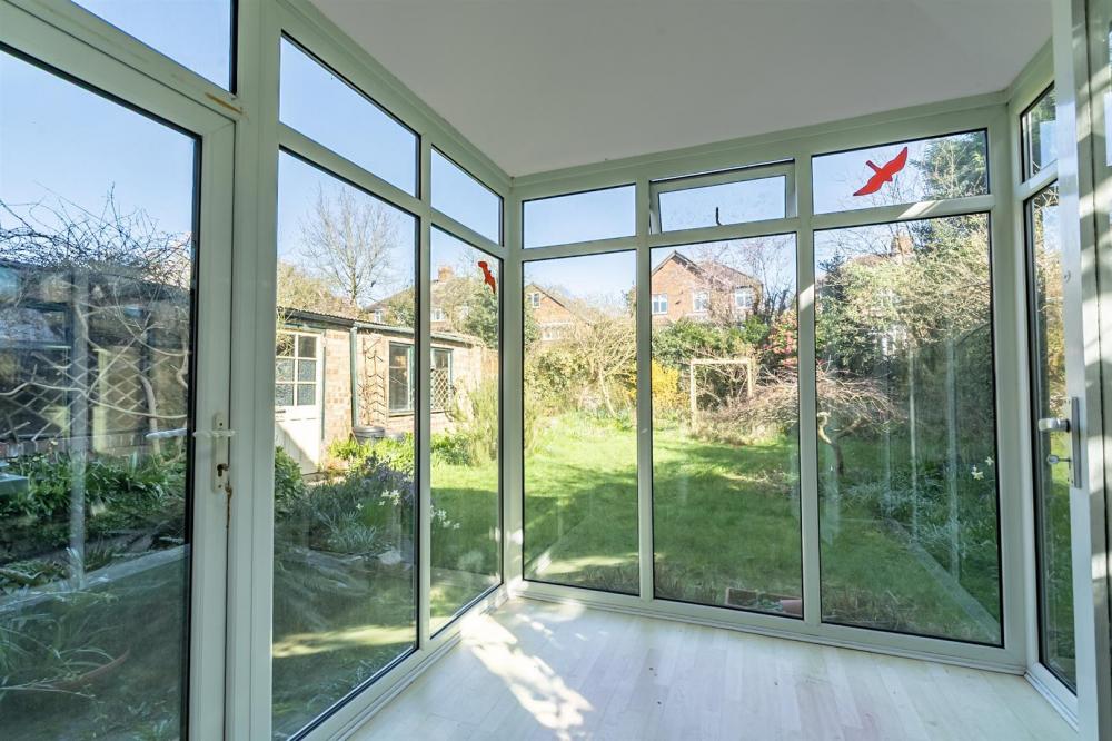 The ground floor comprises a welcoming entrance hallway, a front reception room with adjoining shower room, a kitchen, and a bright living room with access to a conservatory-style garden room, opening out onto the large rear garden.