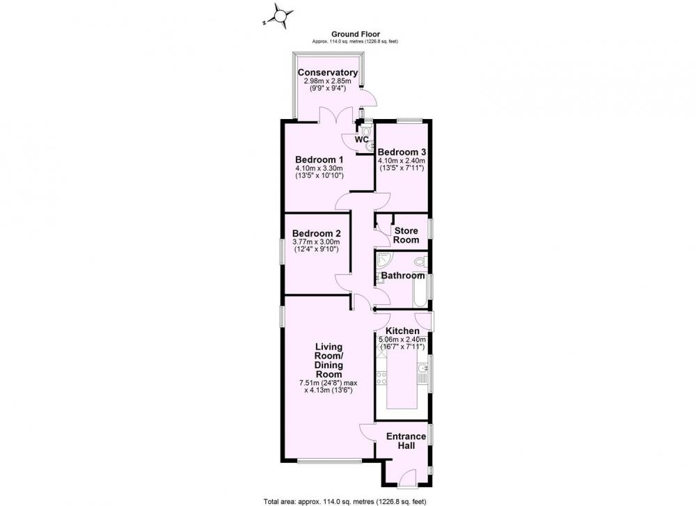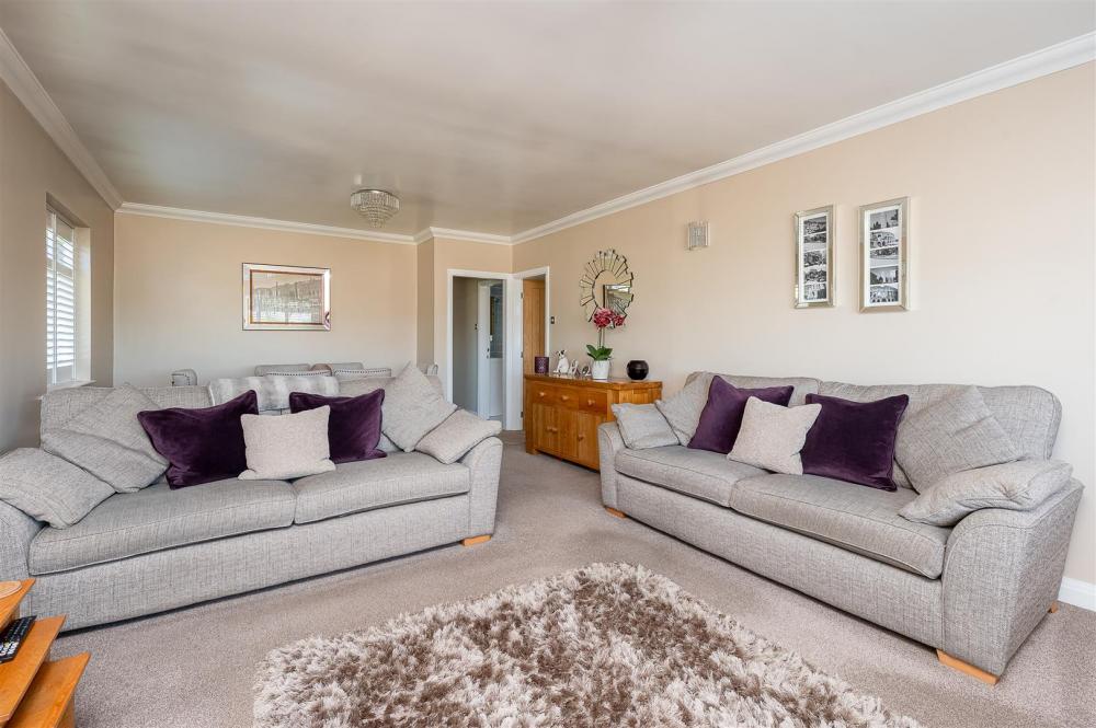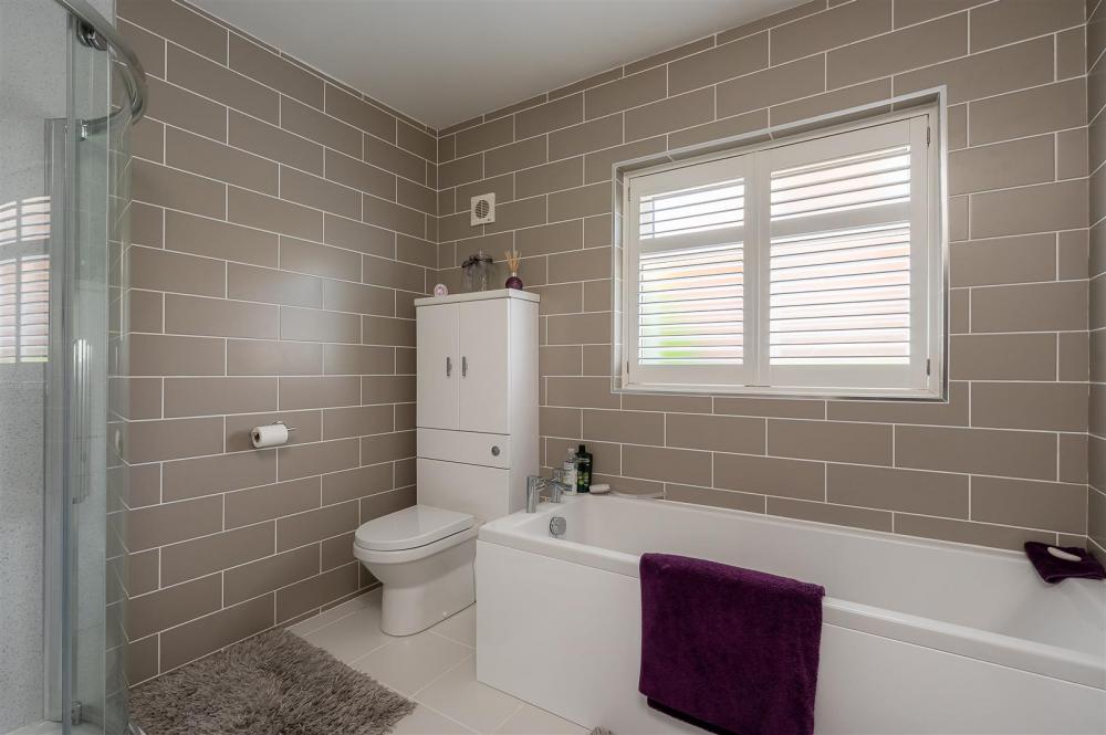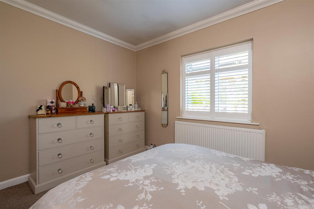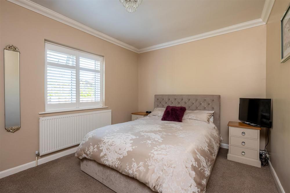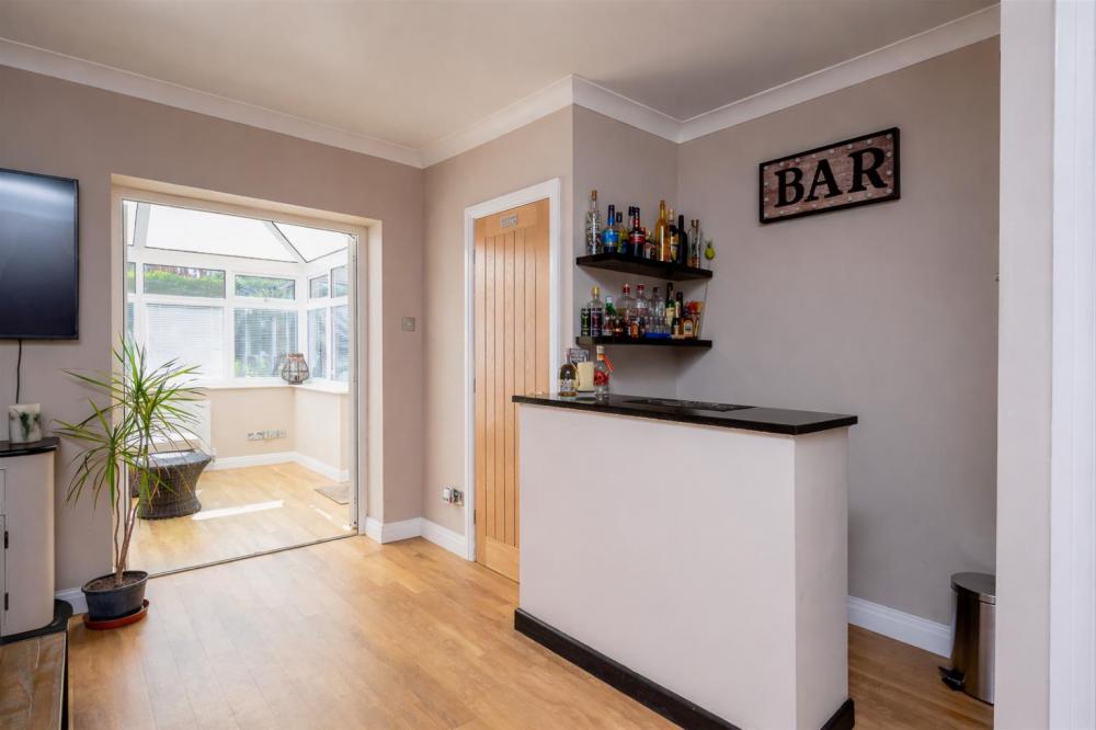 A corridor from the main living space provides access to the stylish family bathroom, which boasts both a bathtub and a separate shower cubicle. Further along is a walk-in storage cupboard and two generously sized double bedrooms. At the rear of the bungalow, a third bedroom is currently configured as a second reception room or bar area. This flexible space includes a separate WC and opens through French doors into a spacious conservatory — perfect for relaxing or entertaining.