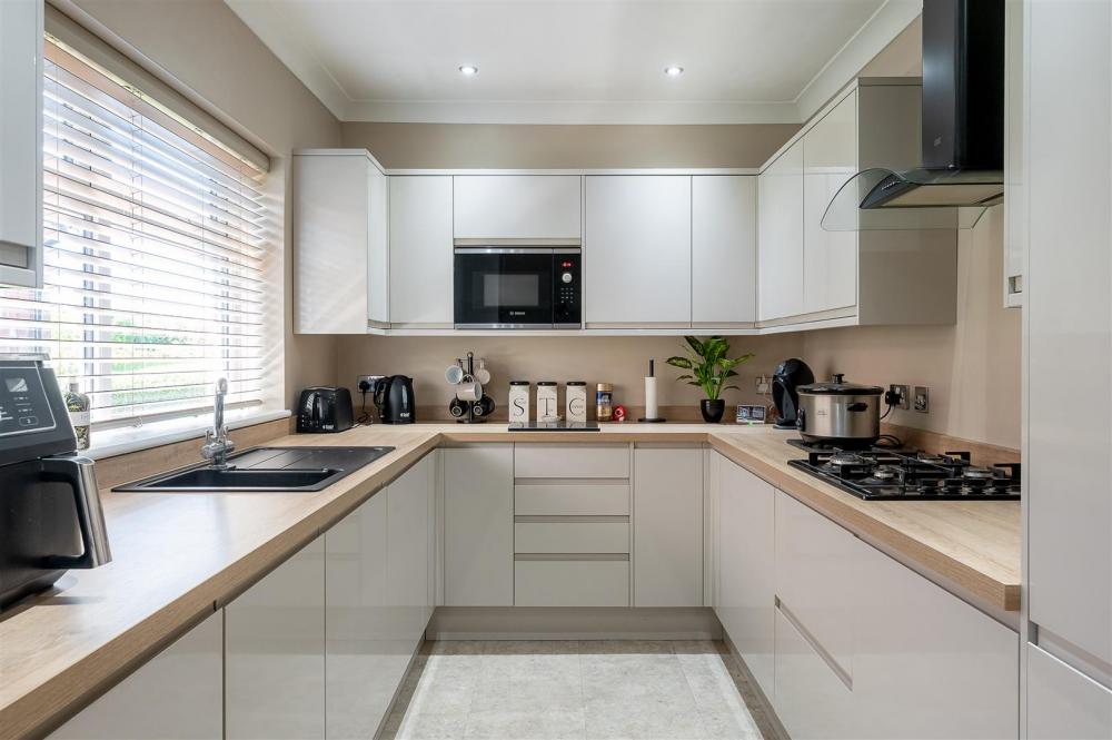 Adjacent to the living area is a superbly appointed kitchen, featuring a contemporary range of fitted units and integrated appliances, including an oven, built-in microwave, and separate gas hob.