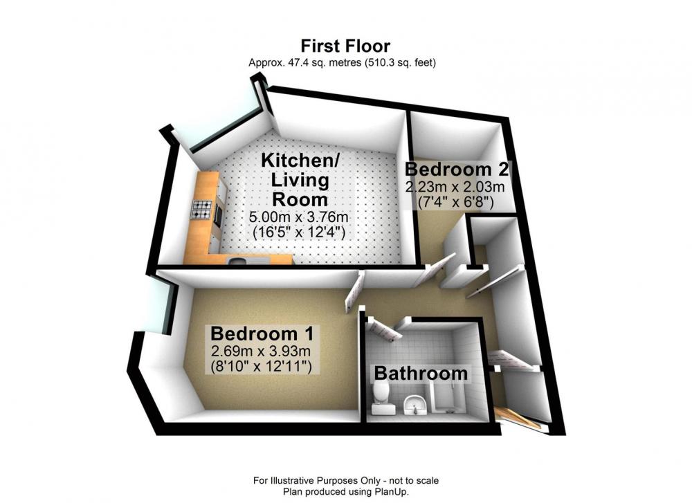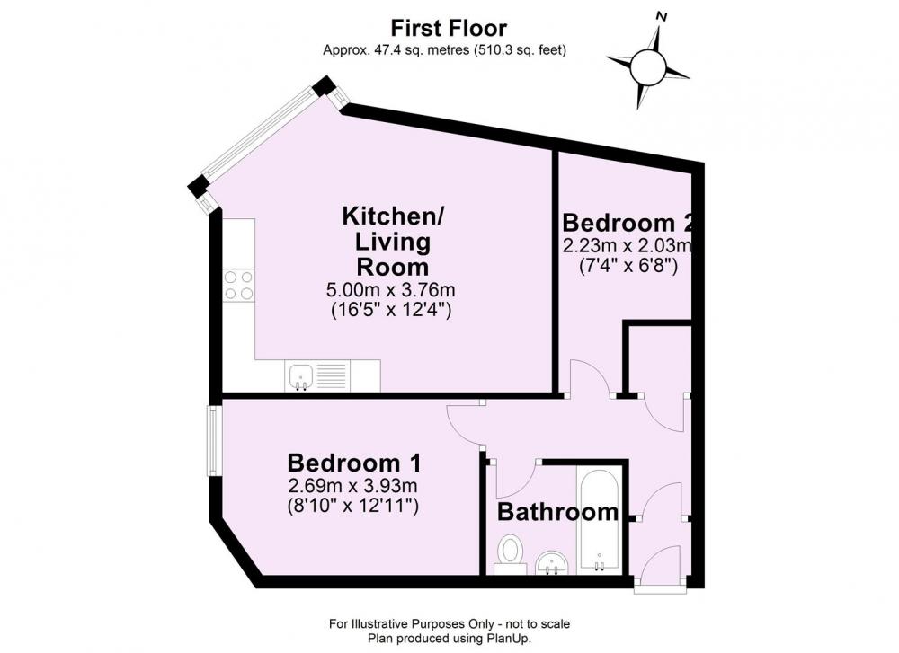 A communal entrance door leads to the first floor and to a private vestibule leading into an L-shaped entrance hall with doors off to all rooms. The unusually shaped open plan living room is designed to make the most of the view along Holgate Road with a large walk in bay window flooding the room with light. To the side is the kitchen area with a good range of wood effect fronted units with integrated cooker and hob with space for a washing machine and under counter fridge. Returning to the hallway, there is a useful storage cupboard, a good sized double bedroom and a single bedroom together with a half tiled bathroom with white suite.