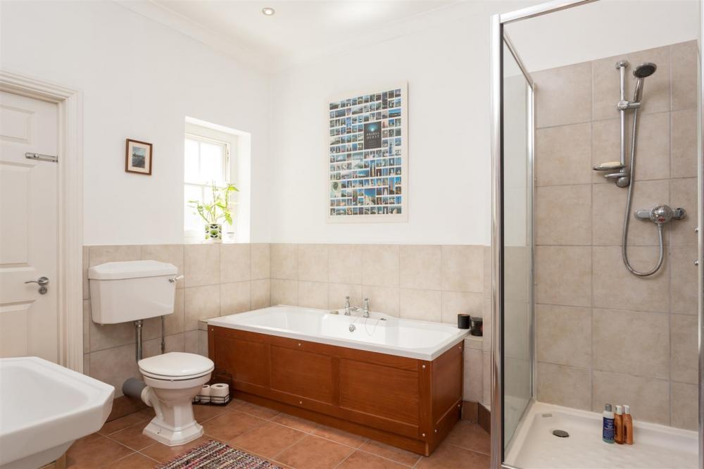 A central hallway leads to the second double bedroom, which is particularly generous in size, and the spacious house bathroom, complete with both a full-sized bath and separate shower cubicle.