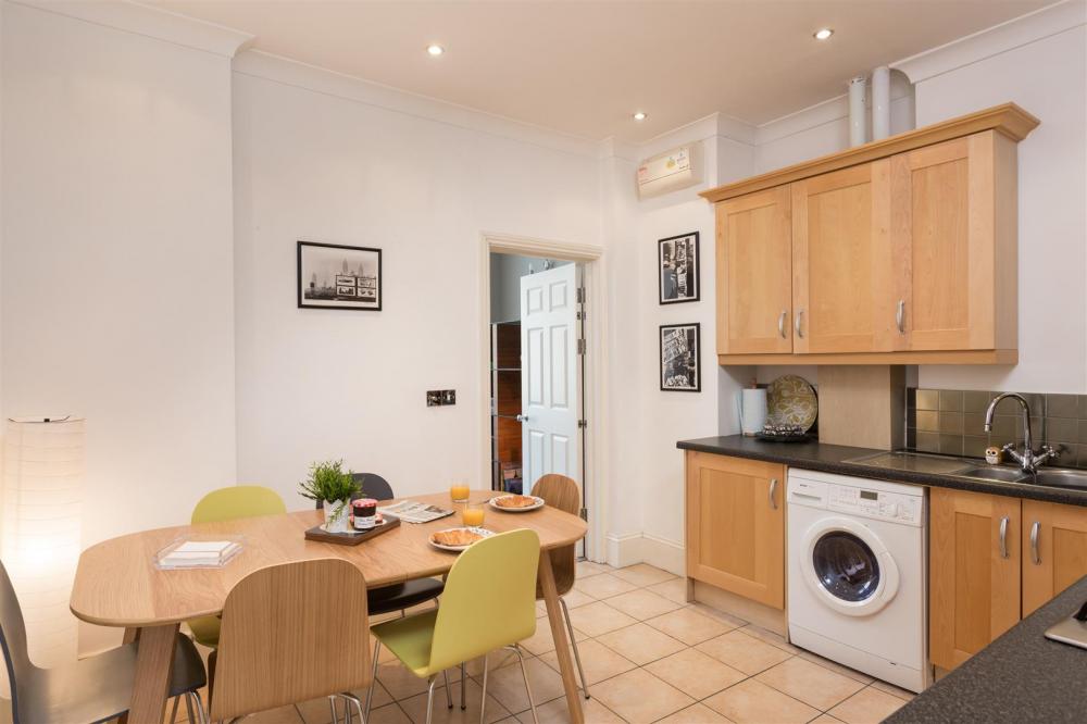 Adjoining the living room is a stylish, modern dining kitchen fitted with a comprehensive range of units, integrated appliances, and space for a dining table, ideal for entertaining.