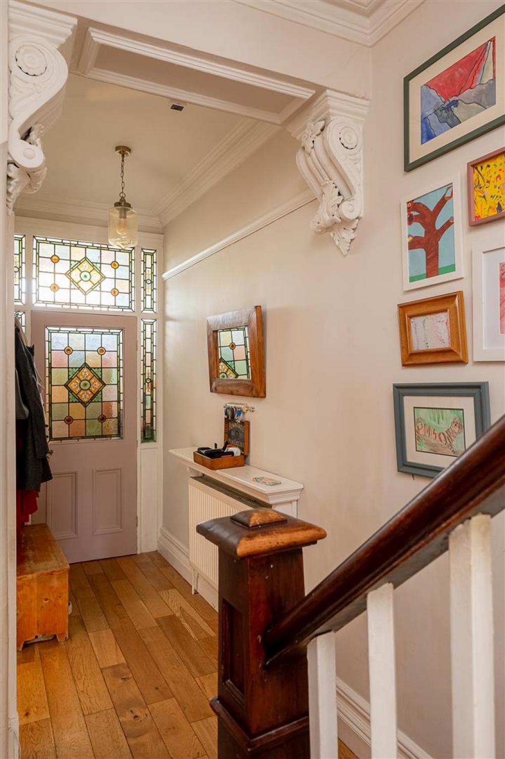 Step inside via a welcoming entrance hall featuring a striking stained glass door, leading into a bright and spacious hallway. The bay-fronted living room to the front impresses with two distinct sitting areas, a cosy log-burning stove, elegant fireplace surround, and bespoke built-in storage.