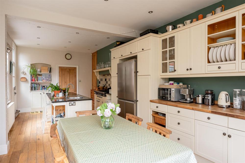 At the heart of the home, the generously sized dining kitchen is fitted with bespoke units featuring stripped pine doors and period details that add warmth and charm. It includes a central island, range cooker, and space for an American-style fridge/freezer. While a handy utility area and a convenient ground-floor shower room complete the ground floor.