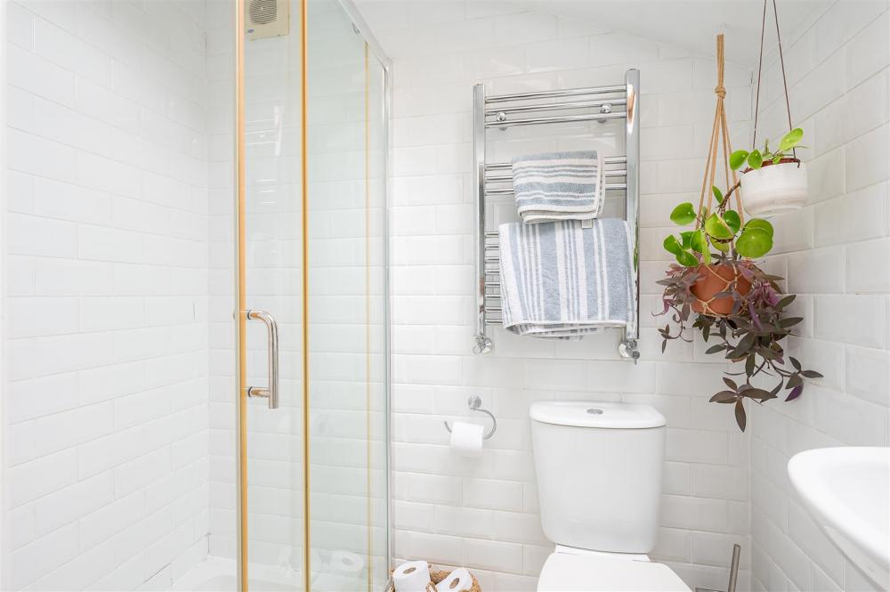 The first floor comprises three well-proportioned bedrooms, including one with an original Victorian fireplace. A stylish family bathroom features a freestanding bathtub alongside a separate shower cubicle.