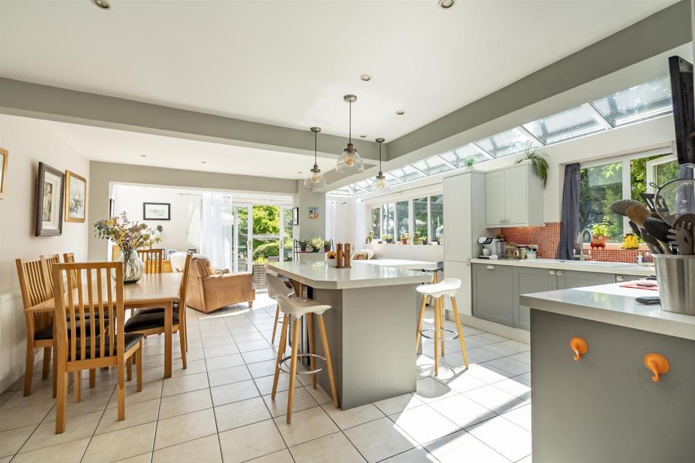 Set back from the main road, this family home is presented to a high standard and is accessed via a wooden door with glazed panel, opening to the hallway, with stairs leading to the first floor. The bay fronted living room has dual aspect windows and centres upon a feature fireplace with stone hearth and log burning stove. Double doors open to the most amazing, modern, open plan kitchen / dining / living space, with a central island, integrated wine fridge and dishwasher as well as a range cooker. A range of windows, sky lights and glazed sliding doors, allows light to flood into the room and makes it an ideal place for entertaining. Leading just off the kitchen is a rear hallway or study area, with a guest WC, a door leading to the rear garden and a utility room completes the ground floor accommodation.