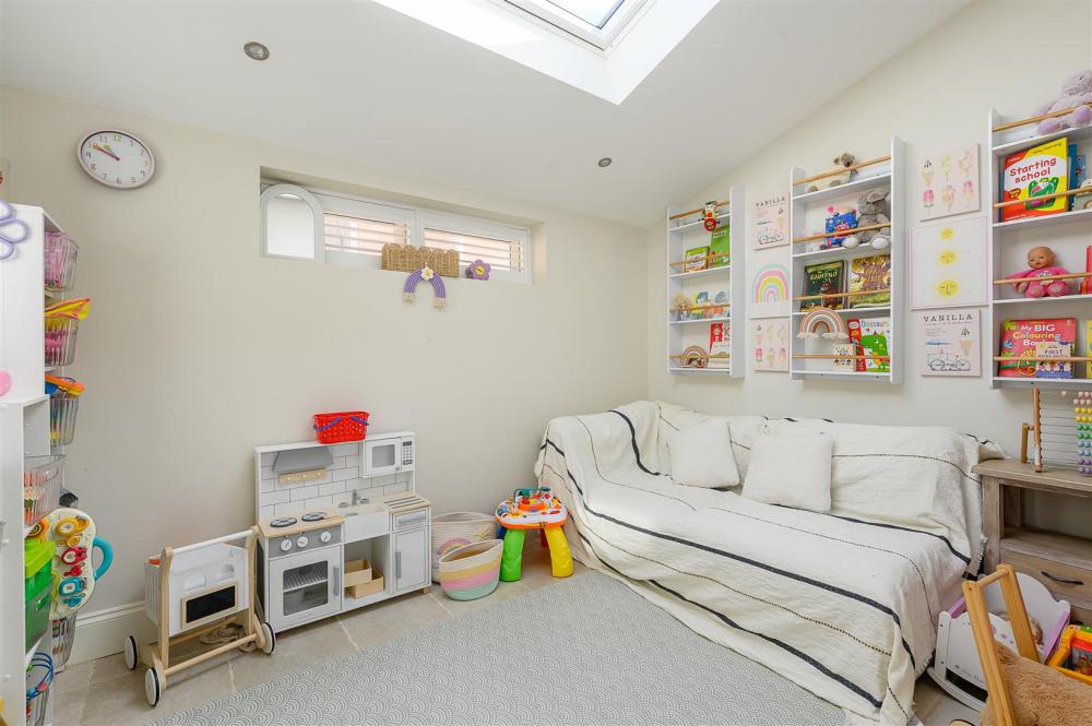 To the rear elevation is the 'hub of the home', a stunning ‘Open Plan’ kitchen dining extension; stylishly fitted with In-frame Cookhouse kitchen with distinctive part vaulted ceiling incorporating Velux windows. The kitchen includes a large island with quartz worktops and breakfast bar offering excellent sociable space, plus a family dining/living area and bespoke sliding doors and shutters enjoying garden views, plus under floor heating to the extended areas. There is a modern cooker including double oven with electric hob and extractor over, a double size Belfast sink plus space for an American style fridge freezer. Integral Neff dishwasher. Wine fridge. Off the kitchen is a large utility room with additional storage cupboards plus rear garden access. There is also a playroom off the kitchen; a versatile room which one could use as a snug.