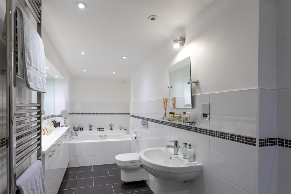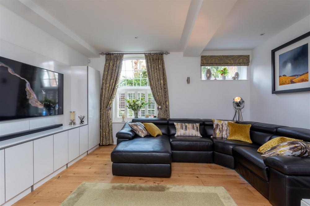 The true hub of the home is the lower ground floor, boasting a modern open plan kitchen / dining / living space great for entertaining guests. The fitted kitchen includes an array of fitted wall and base units, offering ample storage and preparation space. It is equipped with integrated Miele appliances and a range cooker. To finish the accommodation is a study area with fitted wardrobes leading to a luxury four-piece bathroom suite.