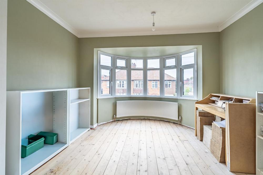 A welcoming arched porch opens into a bright reception hall. To the front, the spacious living room features a wide bay window that floods the room with natural light, complemented by a modern fire surround with electric fire.