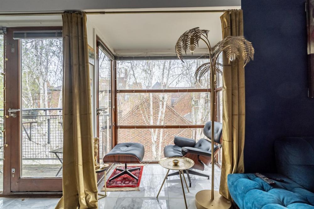 The living space comprises a large lounge and dining area with ceramic tiled flooring, along with glazed doors and windows opening onto the balcony. Adjacent to this is a small additional glazed conservatory area overlooking the surrounding buildings.