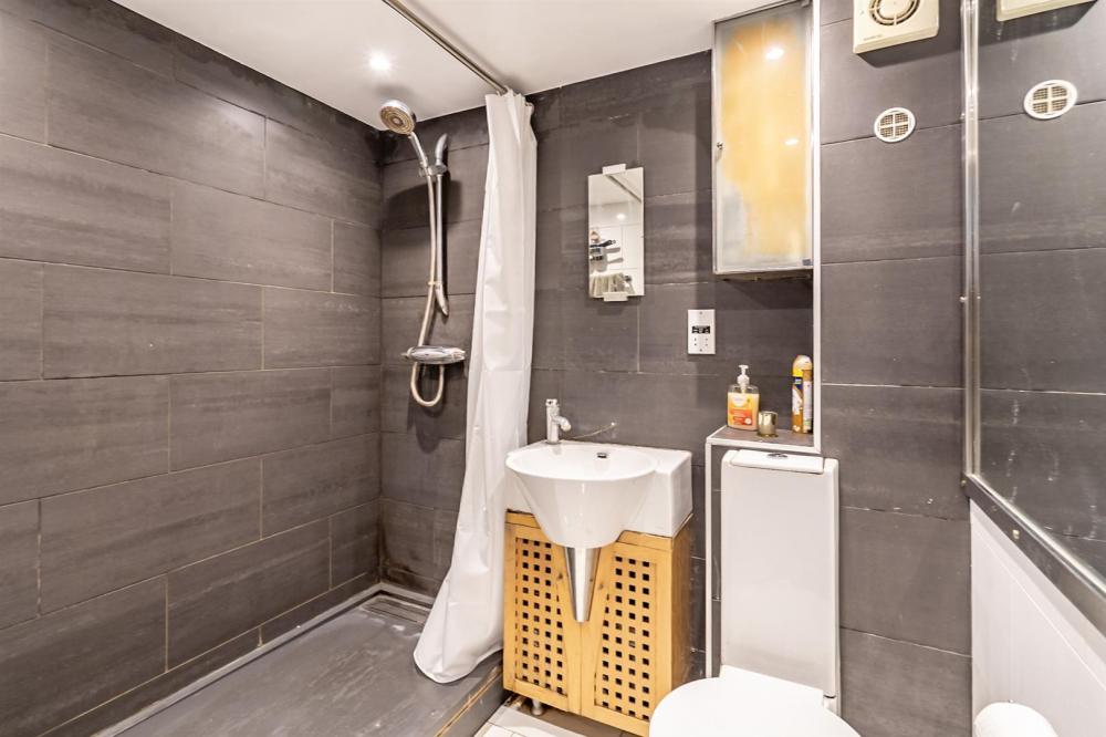 To one side and rear of the living area are the double bedroom and the shower room, which features a walk-in shower.