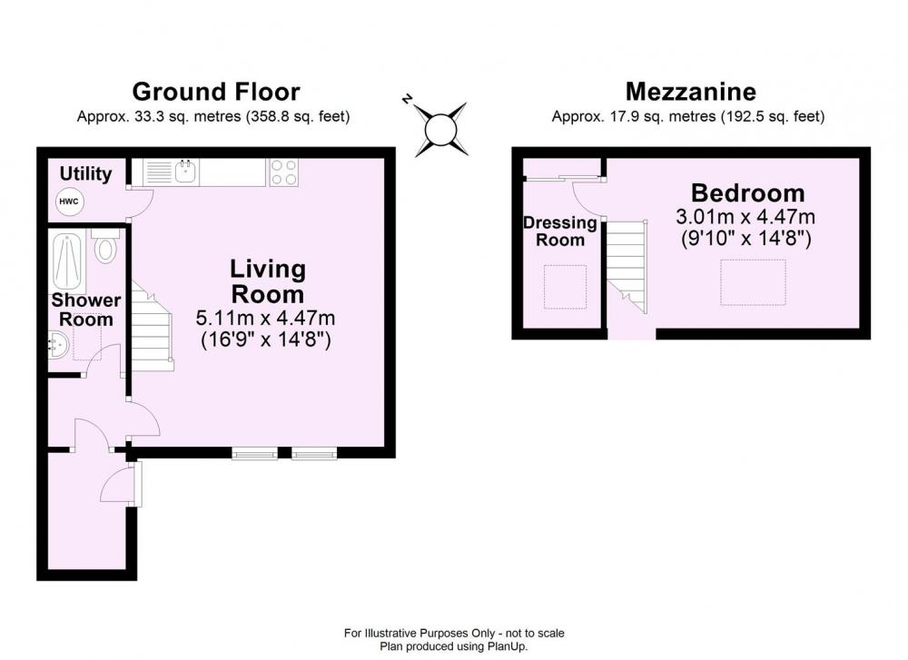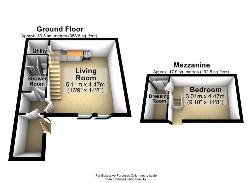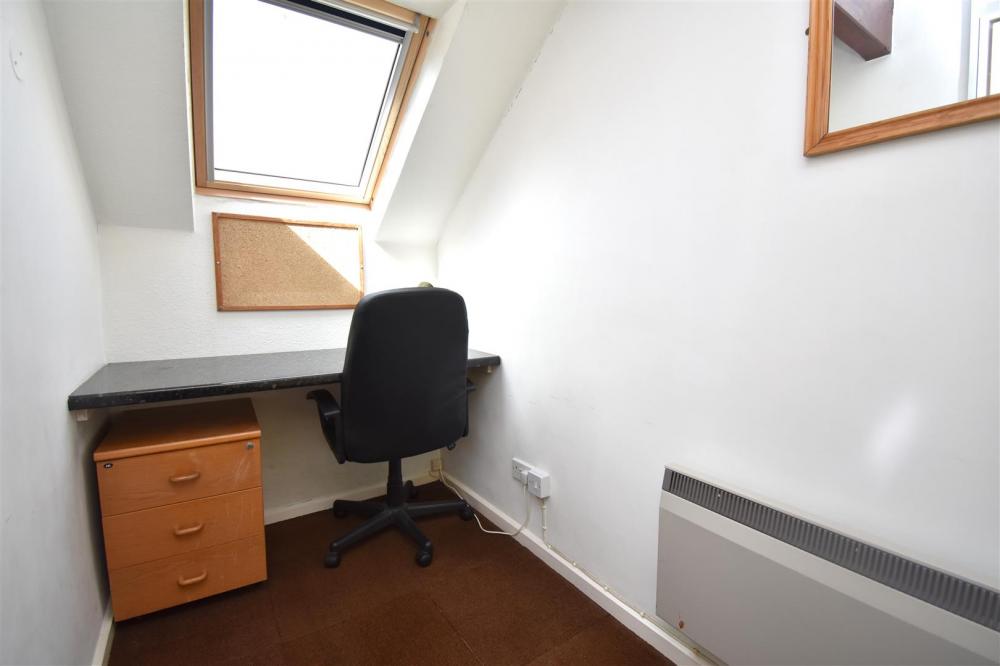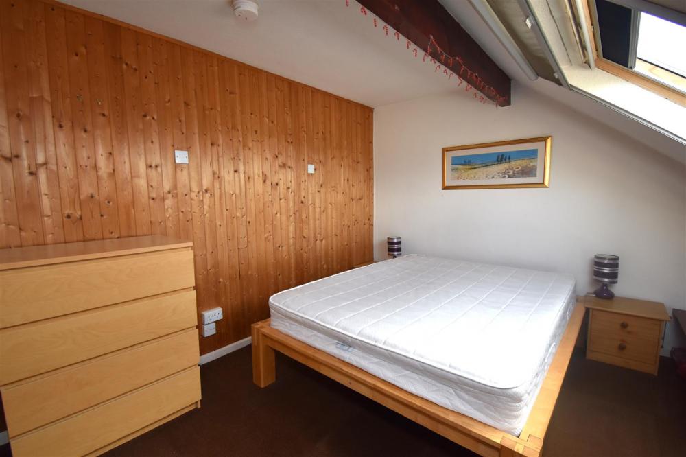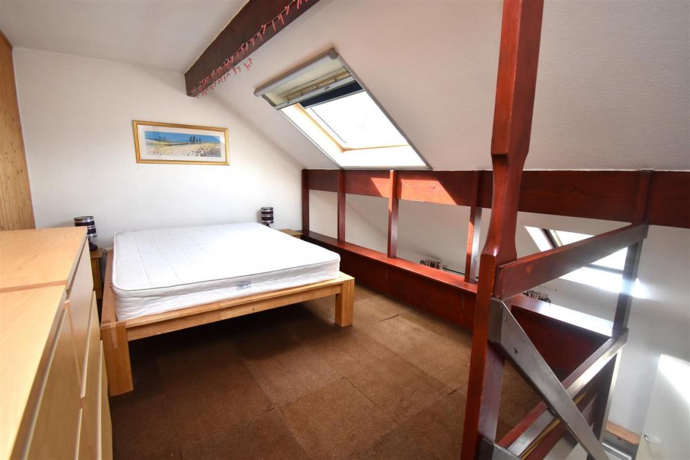 A staircase from the living area leads to a mezzanine double bedroom, featuring a Velux roof light and an additional are, ideal for use as a dressing space or home study.