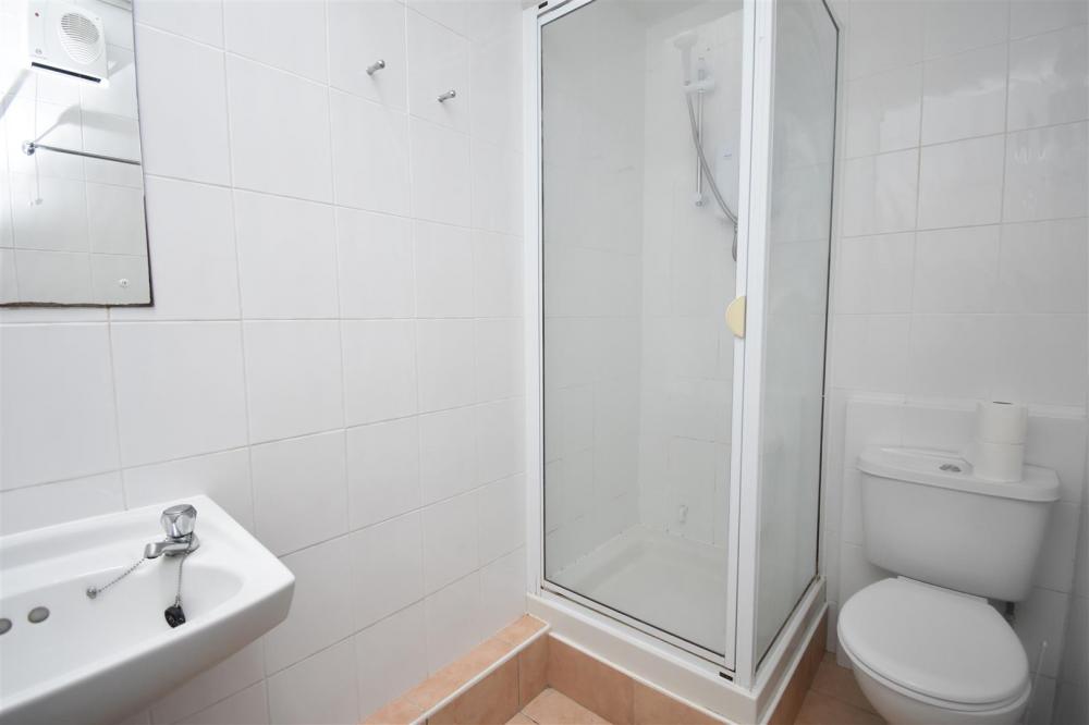 The accommodation opens into an entrance hall leading to a contemporary shower room, fitted with a white suite and shower cubicle. Beyond this, the spacious open-plan living area offers ample room for both relaxing and dining, creating a bright and versatile living space. The kitchen is arranged with a range of fitted wall and base units and provides space for freestanding appliances.