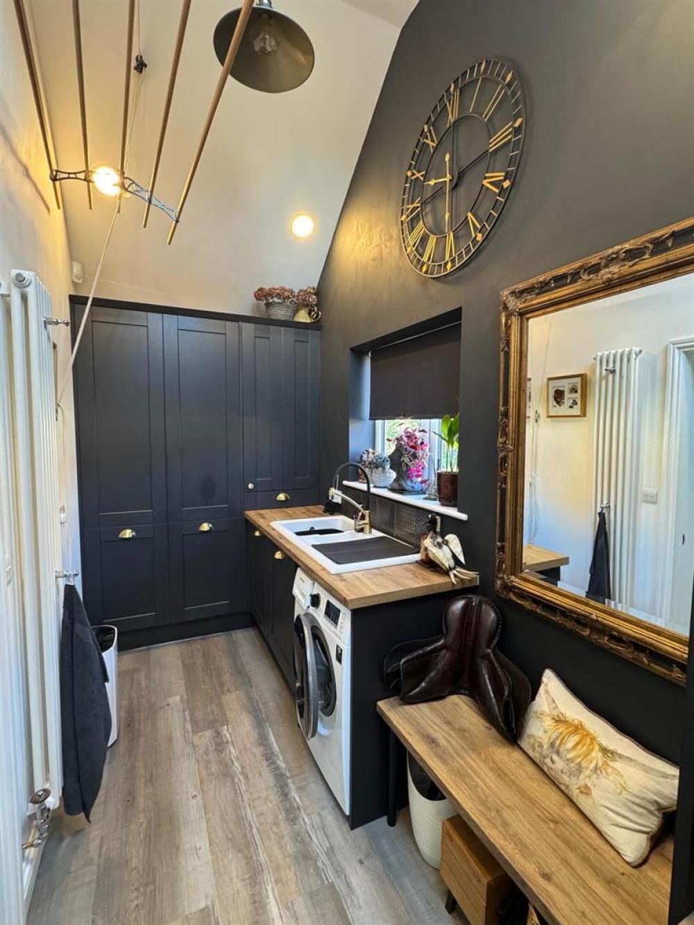 Leading from the kitchen is a well-designed drying/boot room and utility extension with underfloor heating, which offers bespoke Howdens utility units offering excellent storage, space for washer and dryer and an overhead ceiling-mounted drying rack system. The room also features convenient access to the driveway at the side of the property.