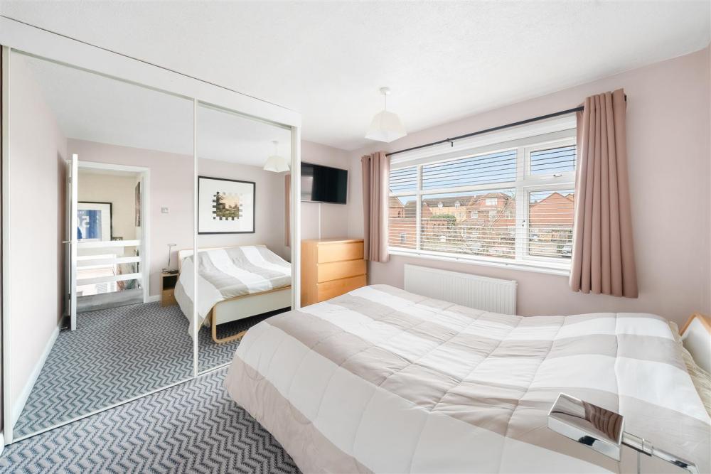 The bright and spacious living area is tastefully decorated in neutral tones and features a modern wall-mounted gas fire, a wide front-facing window, and French doors opening onto the rear decked patio. The kitchen has been slightly extended and benefits from roof lights that provide excellent natural light. It is fitted with a good range of contemporary units, with under-counter space for freestanding appliances and an extractor hood over the cooking area.