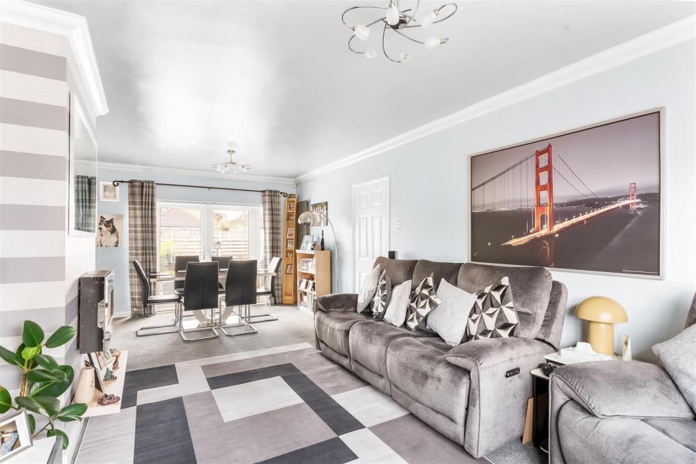A smart, enclosed brick-set forecourt provides off-street parking and leads through a gate to the car port and garage at the rear. The front door opens into a welcoming reception hall with a cloakroom and staircase to one side. Opposite is the impressive living/dining room, with the kitchen positioned to the rear.
