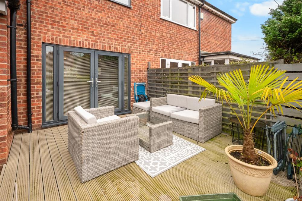 To the rear, the property offers a spacious decked patio and barbecue area, along with a lawn and a useful potting shed.