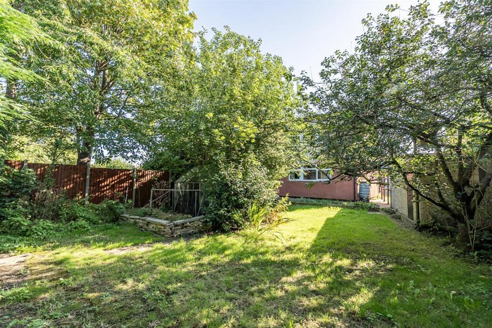 To the rear, a generous and private garden includes a well-maintained lawn, mature shrubs and borders, and an aluminium-framed greenhouse