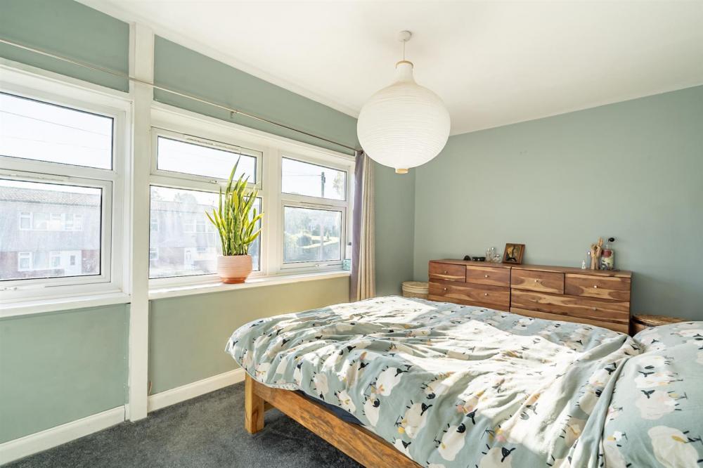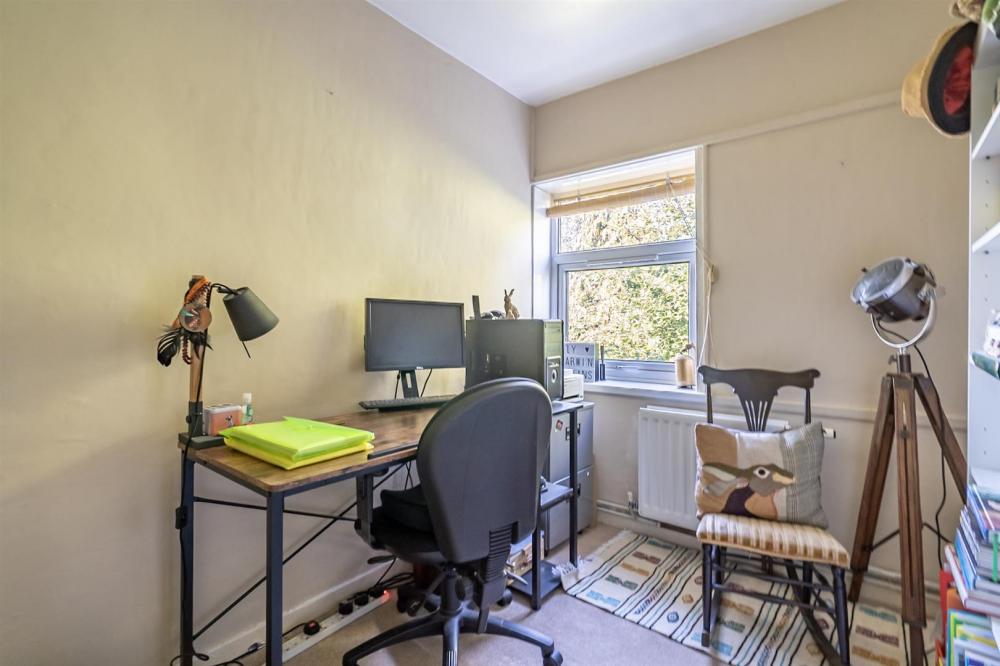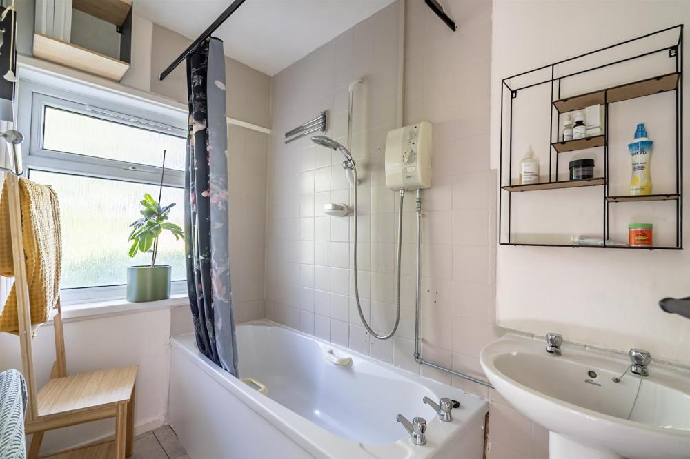 Upstairs, the property offers two well-proportioned double bedrooms—both with built-in storage—alongside a versatile third bedroom, ideal as a nursery or home office. The family bathroom is predominantly tiled and features a white suite with a shower over the bath.