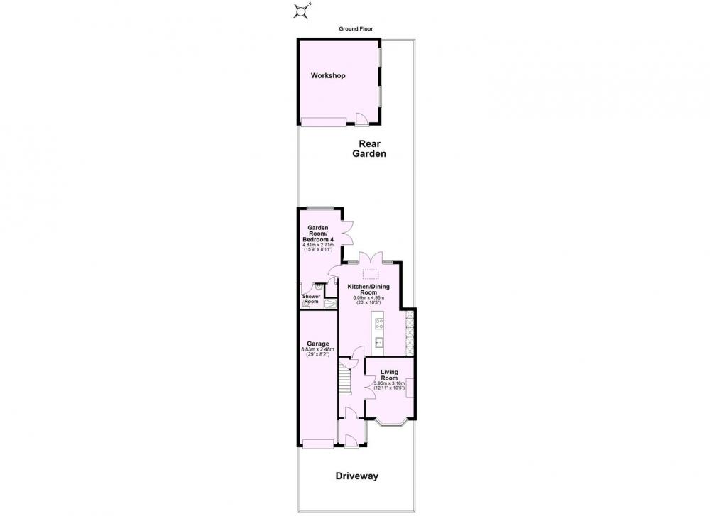 To the rear of the house is a low maintenance garden with artificial turf, timber shed and large workshop