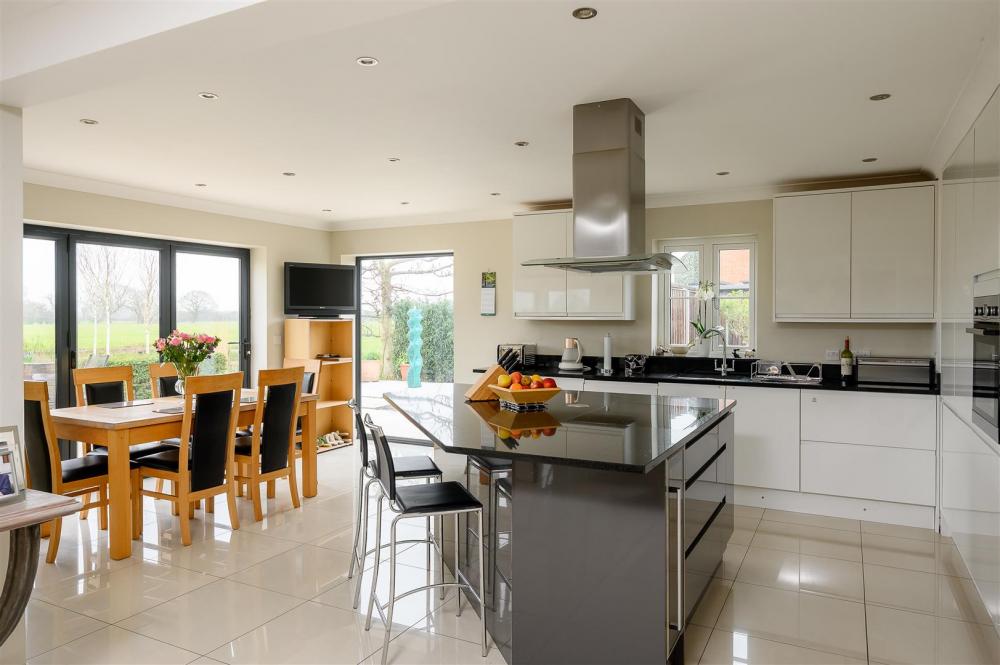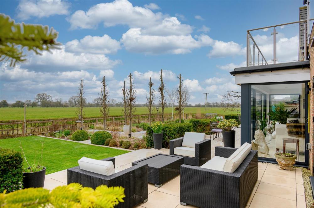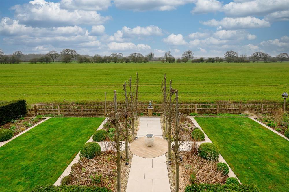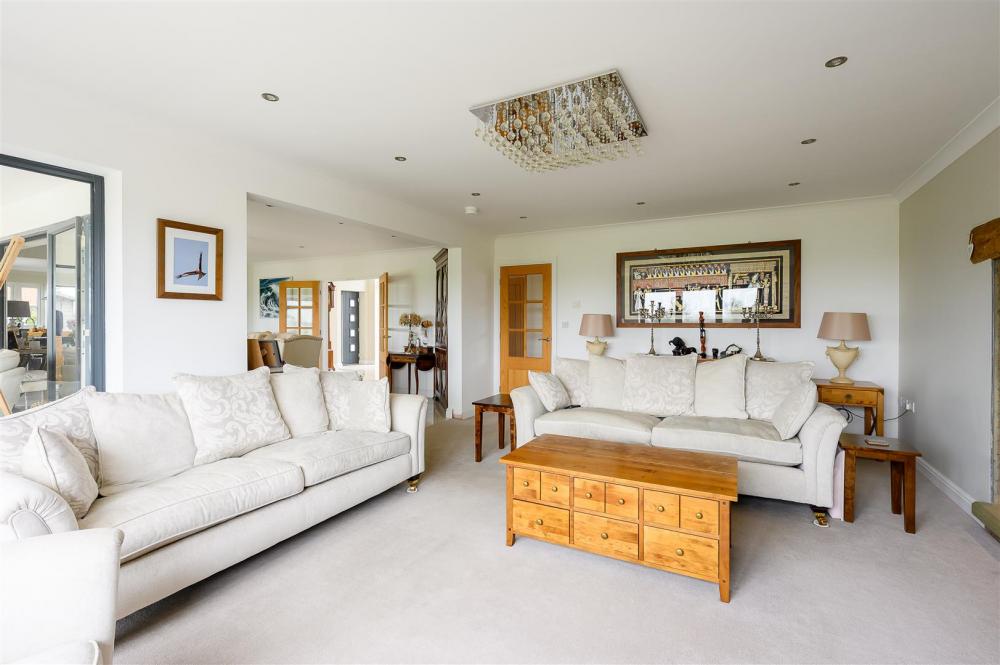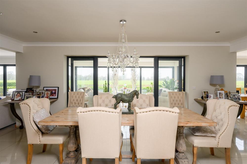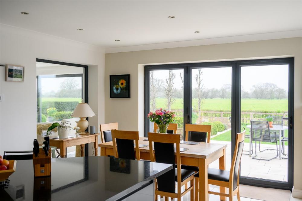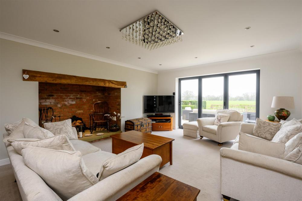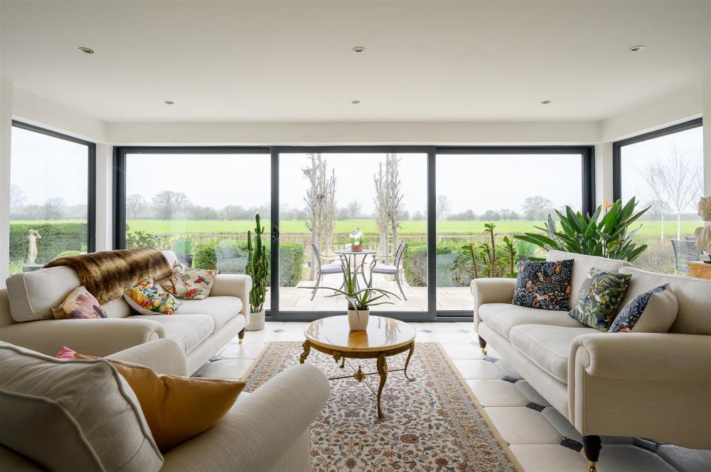 Upon entering, you are welcomed by a grand entrance hallway, enhanced by a spectacular statement chandelier and an open aspect to the first-floor landing above. The heart of the home is the expansive open-plan living, dining and kitchen area, designed with both everyday living and entertaining in mind. This impressive space extends into a rear sunroom, complete with full-height glass doors, which open onto the award-winning garden and enjoy uninterrupted views over open countryside beyond. Large windows, complemented by thoughtfully positioned internal glazing, fill the space with natural light.