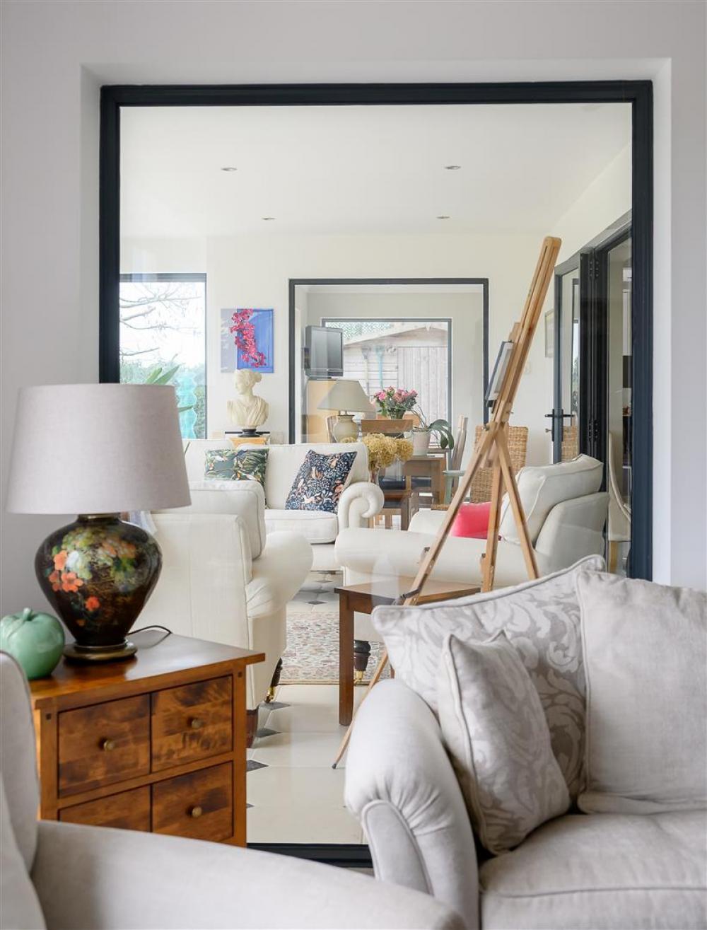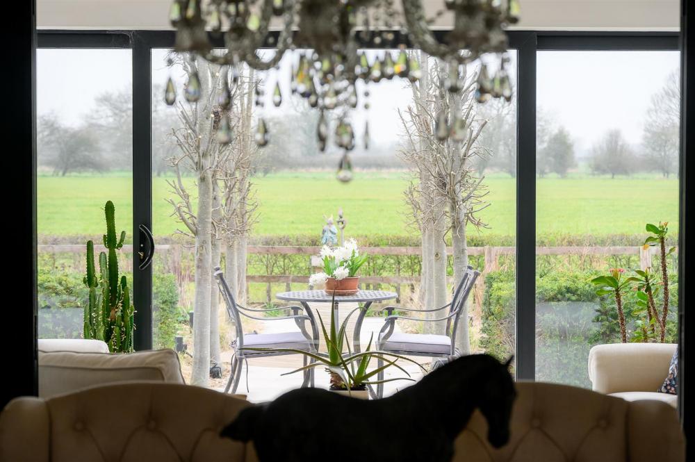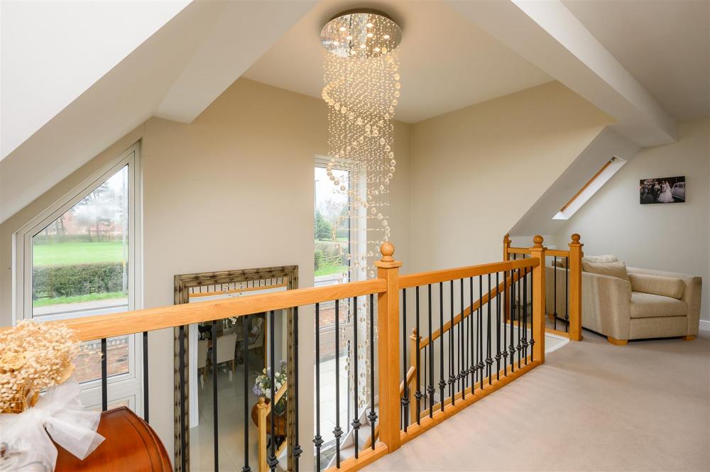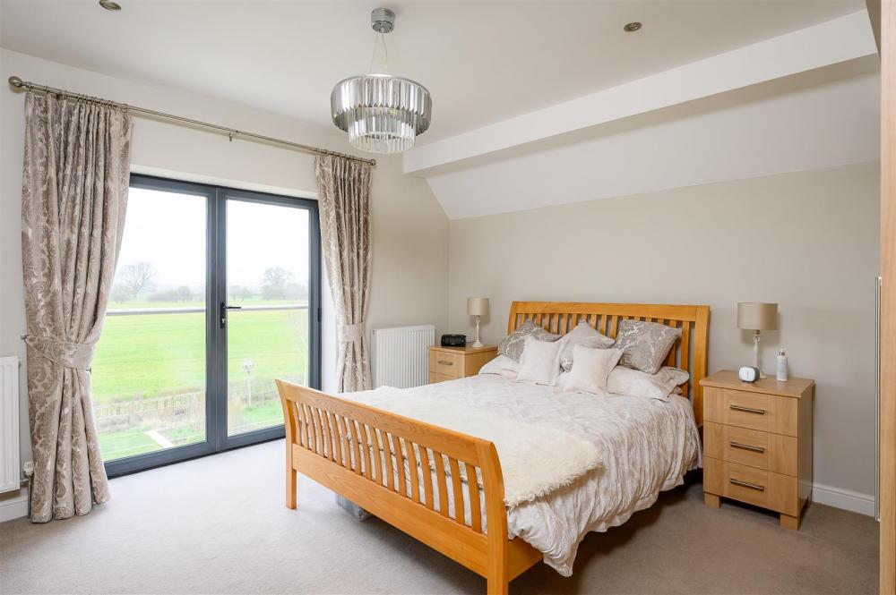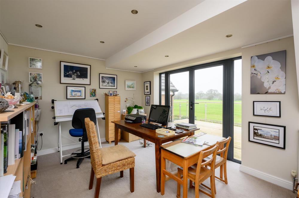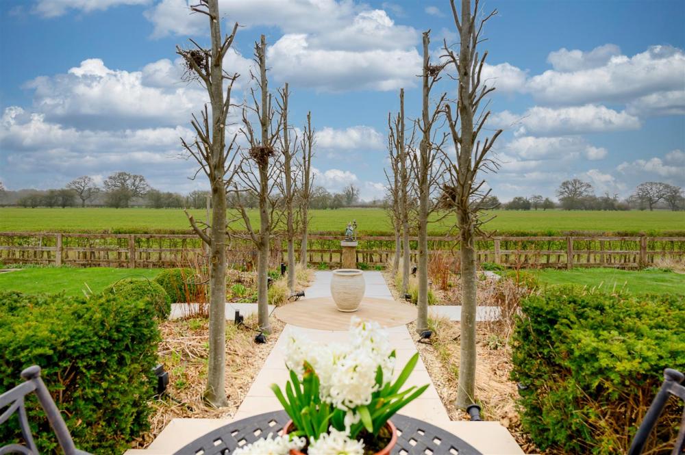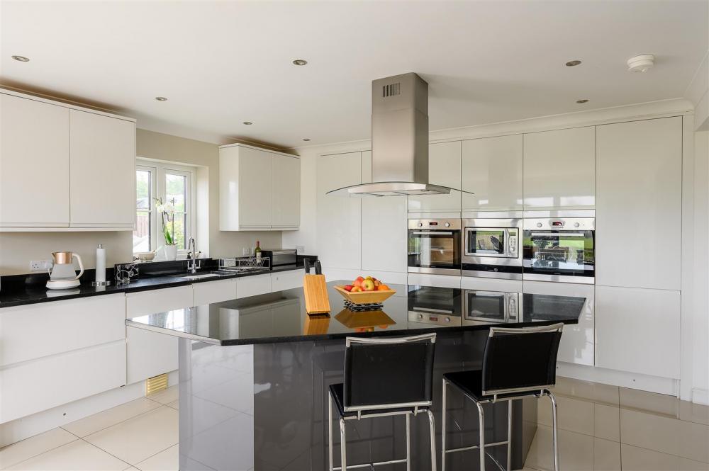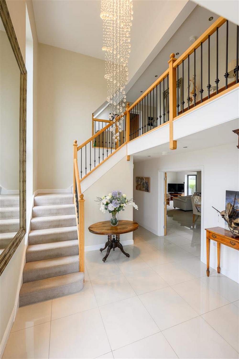 Upon entering, you are welcomed by a grand entrance hallway, enhanced by a spectacular statement chandelier and an open aspect to the first-floor landing above. The heart of the home is the expansive open-plan living, dining and kitchen area, designed with both everyday living and entertaining in mind. This impressive space extends into a rear sunroom, complete with full-height glass doors, which open onto the award-winning garden and enjoy uninterrupted views over open countryside beyond. Large windows, complemented by thoughtfully positioned internal glazing, fill the space with natural light.